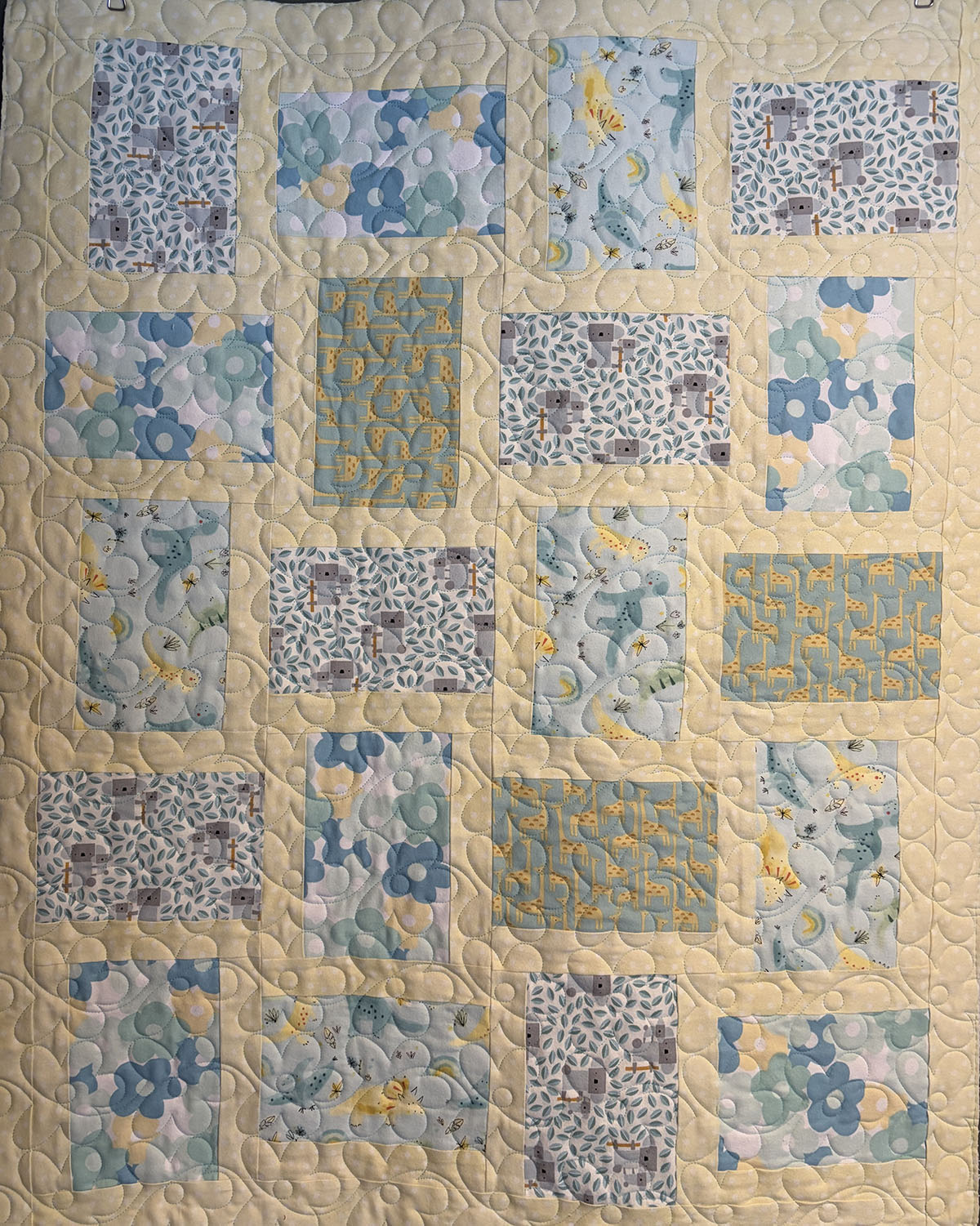 Animal & Flower Baby Quilt pairs sweet novelty prints with soft floral blocks for a cheerful, gentle look. The Flower Power quilting pattern adds rounded, blooming movement across the entire quilt, with large curving petals that soften the patchwork grid and give it a playful, cuddly feel. The light turquoise thread blends beautifully with the cool blue fabrics while still adding definition to the quilting, creating a subtle ripple of texture across the cream background. The color palette of aqua, baby blue, soft yellow, and pale cream feels calm and nursery-friendly, while the mix of flowers, animals, and leafy prints adds charm and curiosity. Overall, this quilt feels light, happy, and comforting—playful enough for a baby quilt, but polished with enough texture and flow to make the whole design feel cohesive and full of warmth.