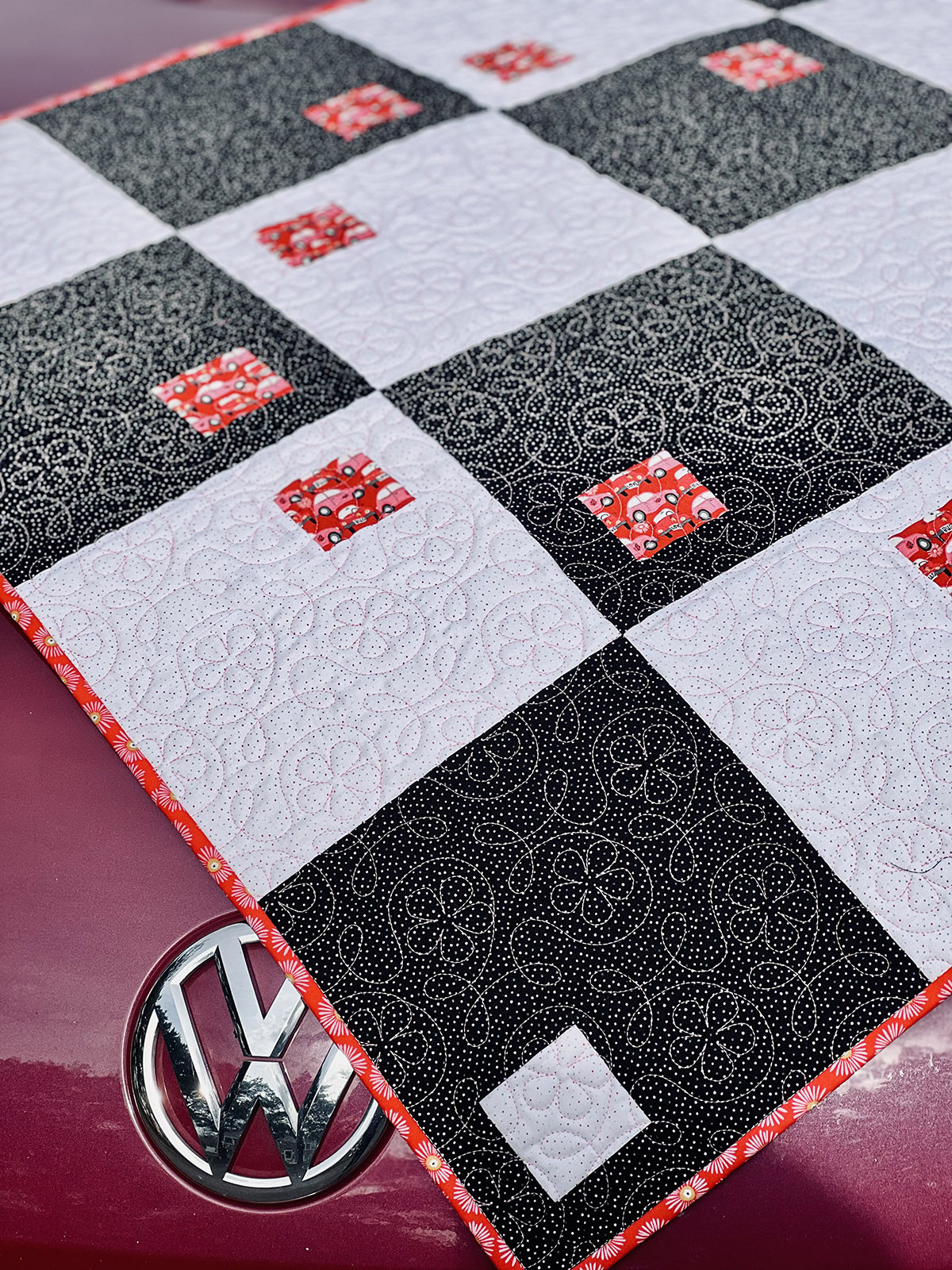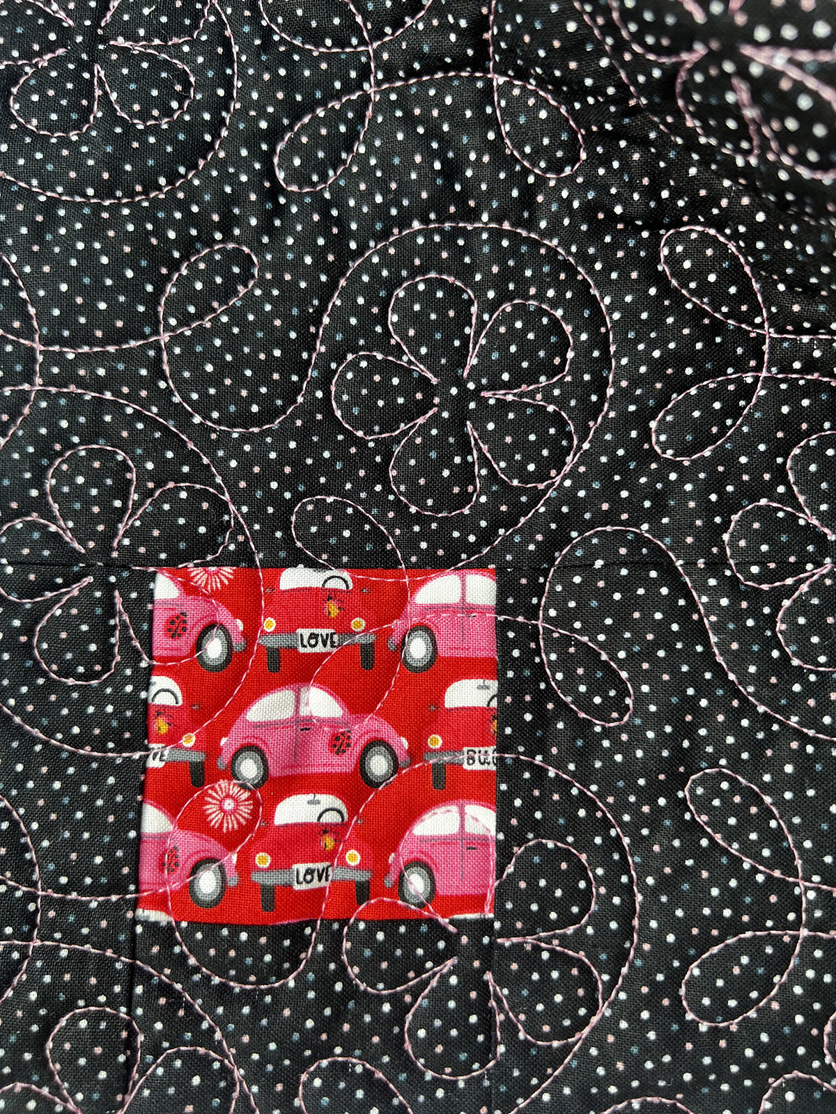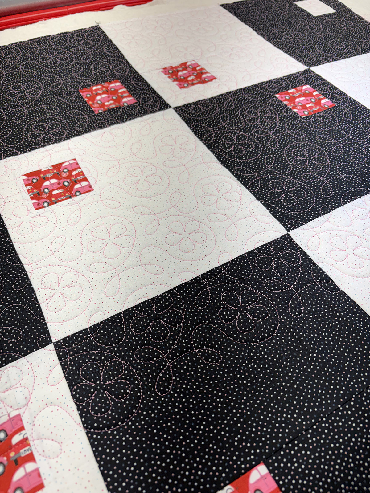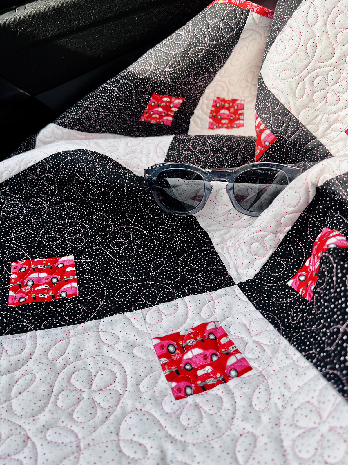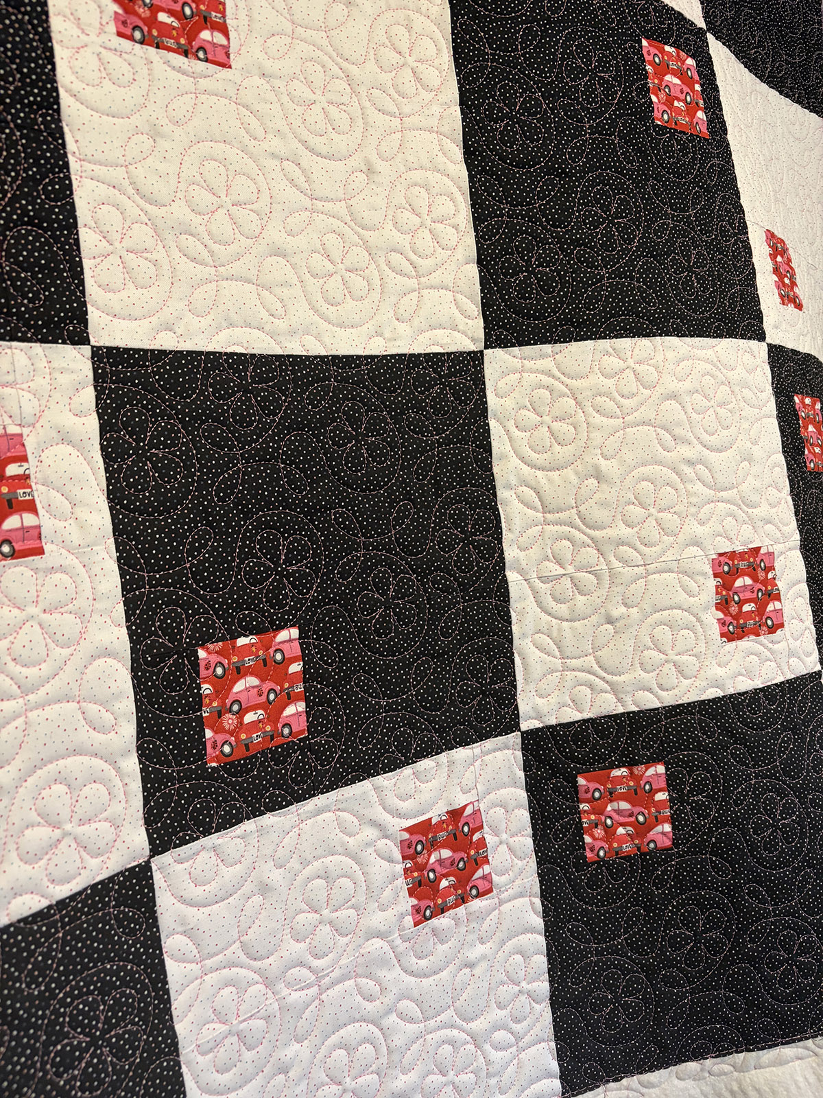 Beep Beep! is crisp, playful, and full of graphic charm. The bold black-and-white checkerboard layout gives it a clean, modern look, while the tiny red novelty squares packed with cheerful cars add personality and a bright pop of color. Soft pink accents in the thread and binding warm up the high-contrast palette, making the quilt feel both stylish and fun. The Ginger Flower quilting pattern adds a whimsical layer of motion with looping swirls and oversized floral shapes that dance across the surface. Quilted in candy pink thread, the stitching stands out beautifully on the black blocks and stays delicately sweet on the white ones, creating a lovely balance of contrast and softness. Altogether, this quilt feels lively, fresh, and happy—modern in design, but full of playful warmth.