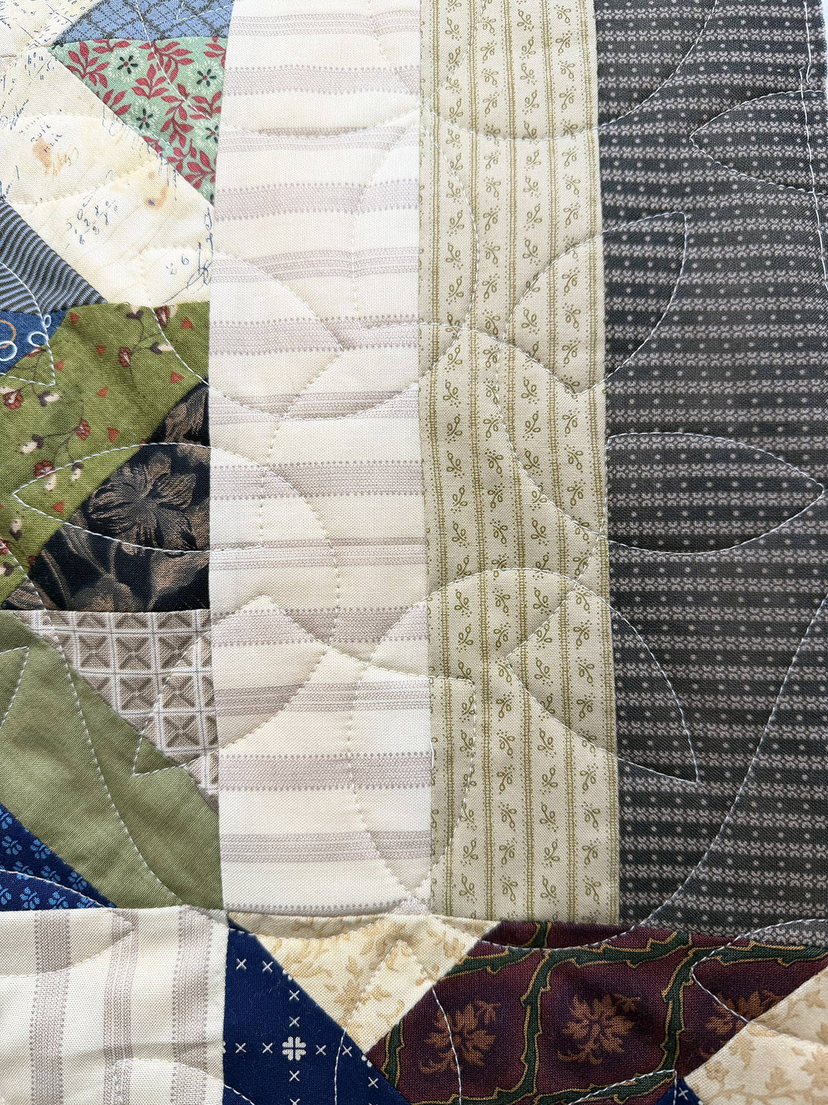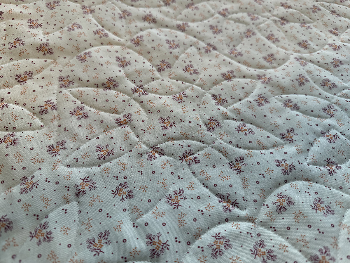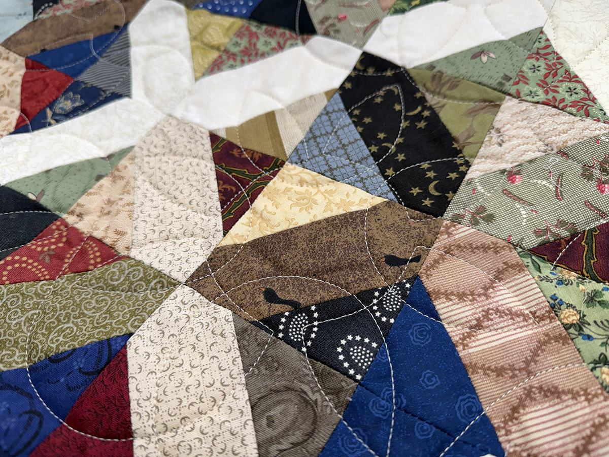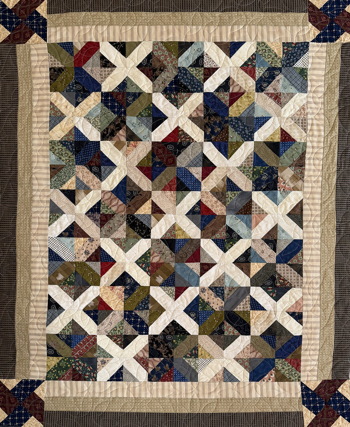 The Civil War Quilt radiates a warm, storied charm, evoking the spirit of heritage and hearth. Each block features an intricate interplay of reproduction prints in earthy tones—burgundy, indigo, sage, and wheat—woven together to form bold X motifs that pulse with quiet rhythm and movement. The cream thread stitching, using the graceful Sunflower pattern, arcs gently over the surface in curved petals and loops, softening the geometric piecing with a blooming, organic touch. The quilting dances across light and dark fabrics alike, unifying them with a gentle lilt, much like sunlight cast over a garden. This quilt is a heartfelt tribute to tradition, sewn with both reverence and artistry.
