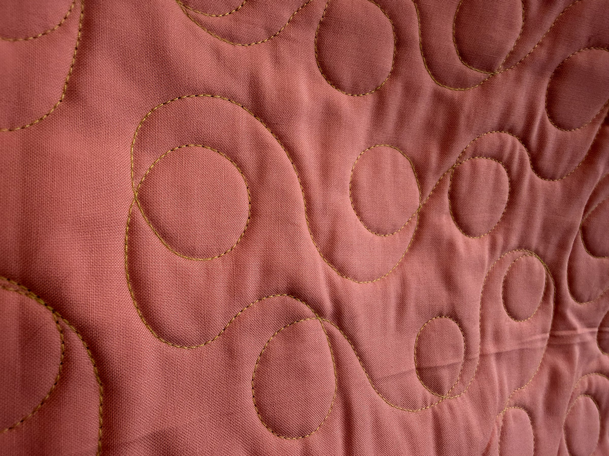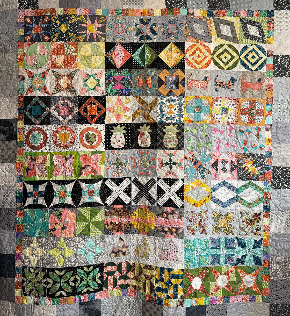 Colorful Blocks is a joyful sampler quilt bursting with personality, where each block brings its own shape, motif, and surprise. The mix of bright florals, playful prints, graphic black-and-white accents, and soft gray framing gives the quilt a lively, collected feel. Pops of coral, pink, teal, lime, yellow, and orange keep the eye moving, while the gray sashing and border pieces provide balance and let every block shine. The Loops quilting pattern ties this wonderfully varied design together with flowing curves and rounded circles that drift across the surface with easy rhythm. Quilted in bright light green thread, the stitching adds a fresh, energetic accent that stands out beautifully on both the grays and the saturated prints. The result is a quilt that feels whimsical, modern, and full of delight—playful in spirit, richly detailed, and impossible to look at just once.