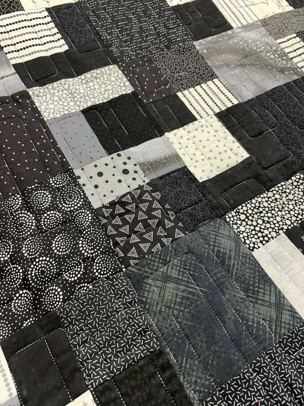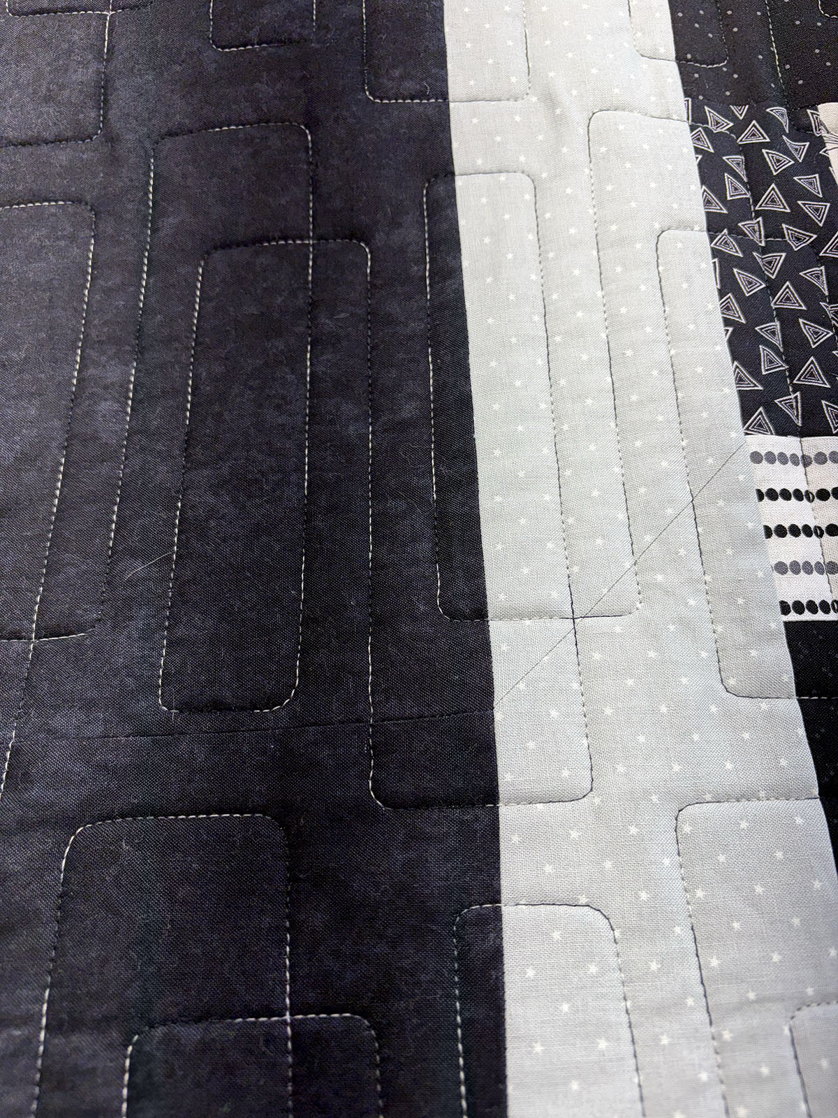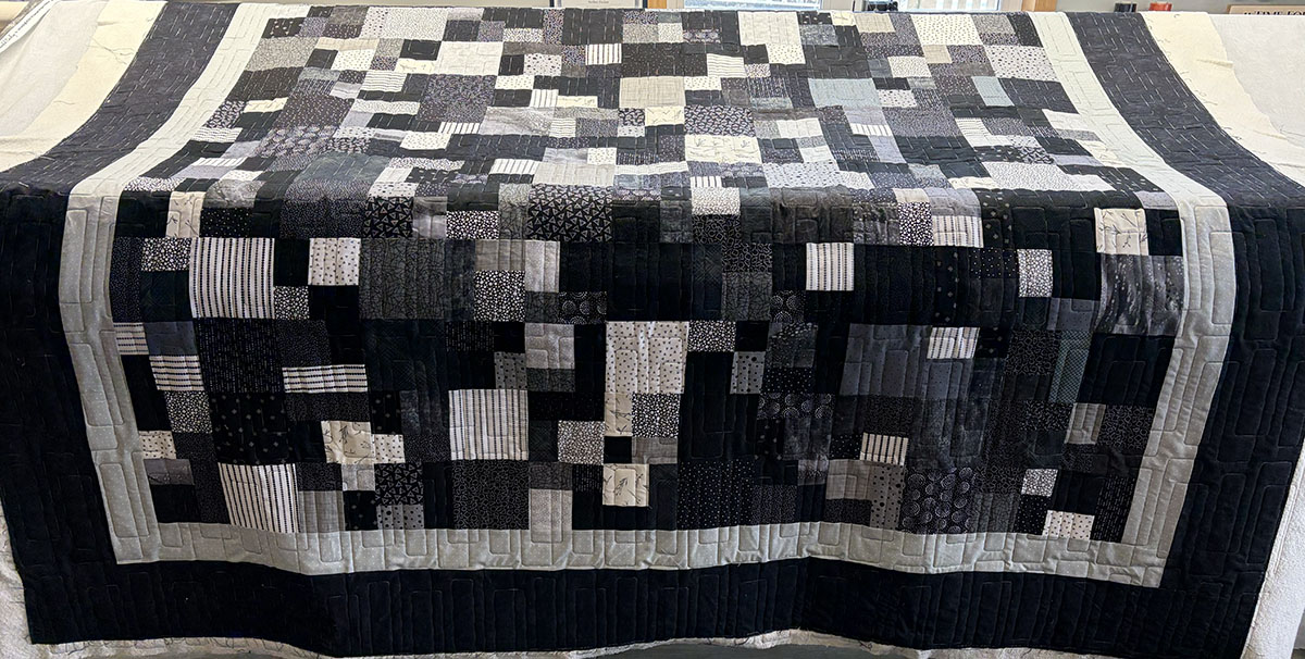Connor’s Quilt has a bold, modern style defined by the graphic structure of the City Windows quilting pattern. Quilted in variegated black and white thread, the design adds subtle contrast and depth, tracing the rectangular motif in a way that feels architectural and clean. The pattern reinforces the pieced layout beautifully, giving the quilt a sleek sense of order and movement. The monochrome palette of black, charcoal, gray, and soft white creates a striking, sophisticated look, while the mix of prints adds texture and visual interest without disrupting the quilt’s calm, contemporary feel. Altogether, this quilt feels crisp, urban, and effortlessly cool—a strong modern design with a polished, masculine edge.