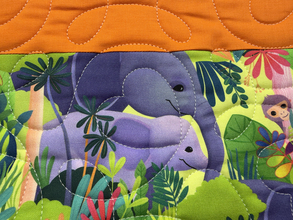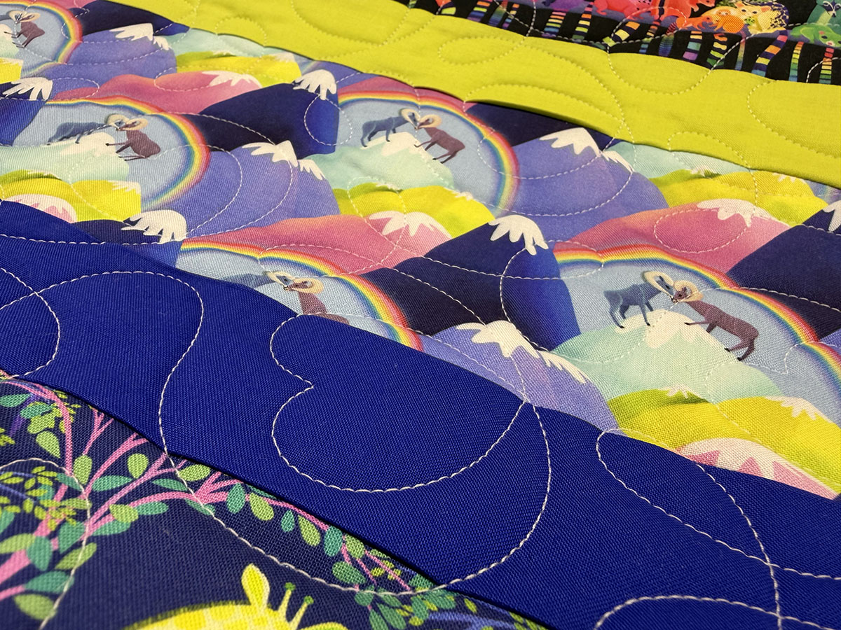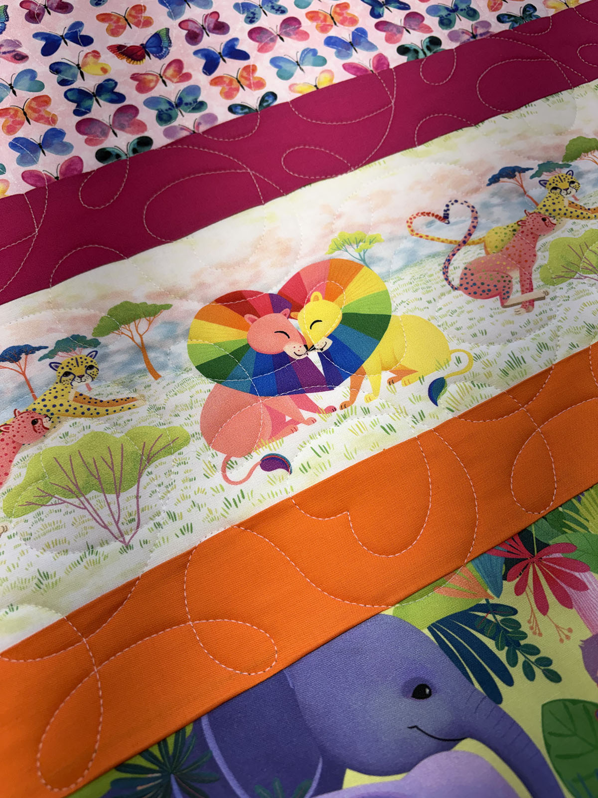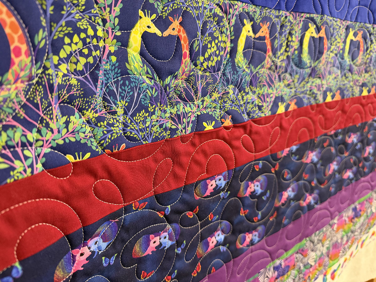 Love in the Wild is bursting with color, joy, and playful energy. The Ginger Heart quilting pattern adds a sweet layer of movement across the striped design, with flowing curves and heart-like loops that soften the bold horizontal layout and tie all the lively prints together. The Natural White thread is a smart choice here, giving the quilting gentle definition without competing with the vivid fabrics. It shows up beautifully across the saturated pink, orange, yellow, blue, and purple stripes, while also blending nicely into the lighter prints. The rainbow palette feels bright and celebratory, and the mix of butterflies, elephants, giraffes, zebras, and other whimsical animal scenes gives the quilt a fun storybook charm. Overall, this quilt feels happy, loving, and full of life. The colorful striped composition paired with the looping heart-inspired quilting creates a design that feels both energetic and affectionate—perfect for a child’s quilt with a bold, cheerful personality.