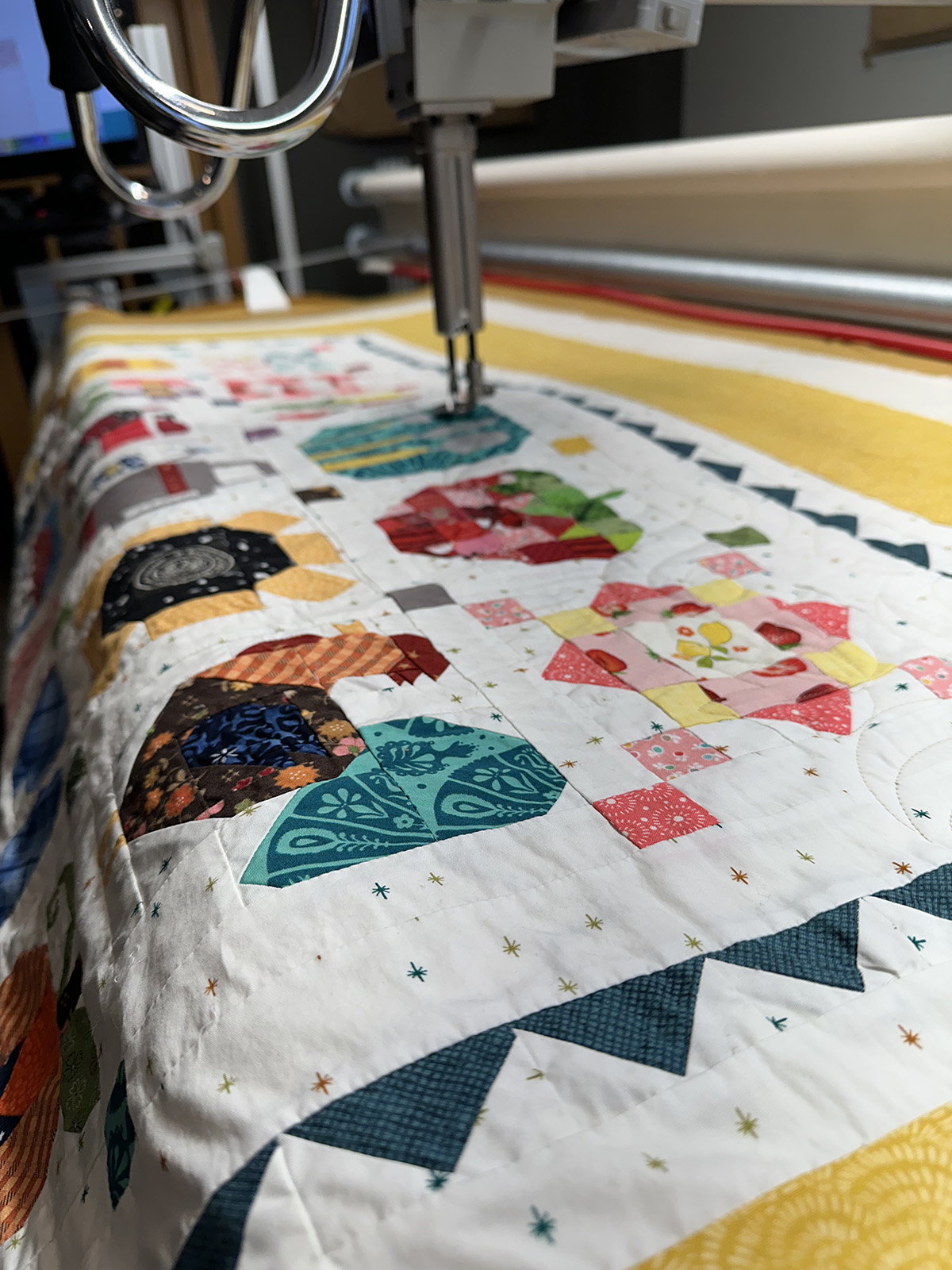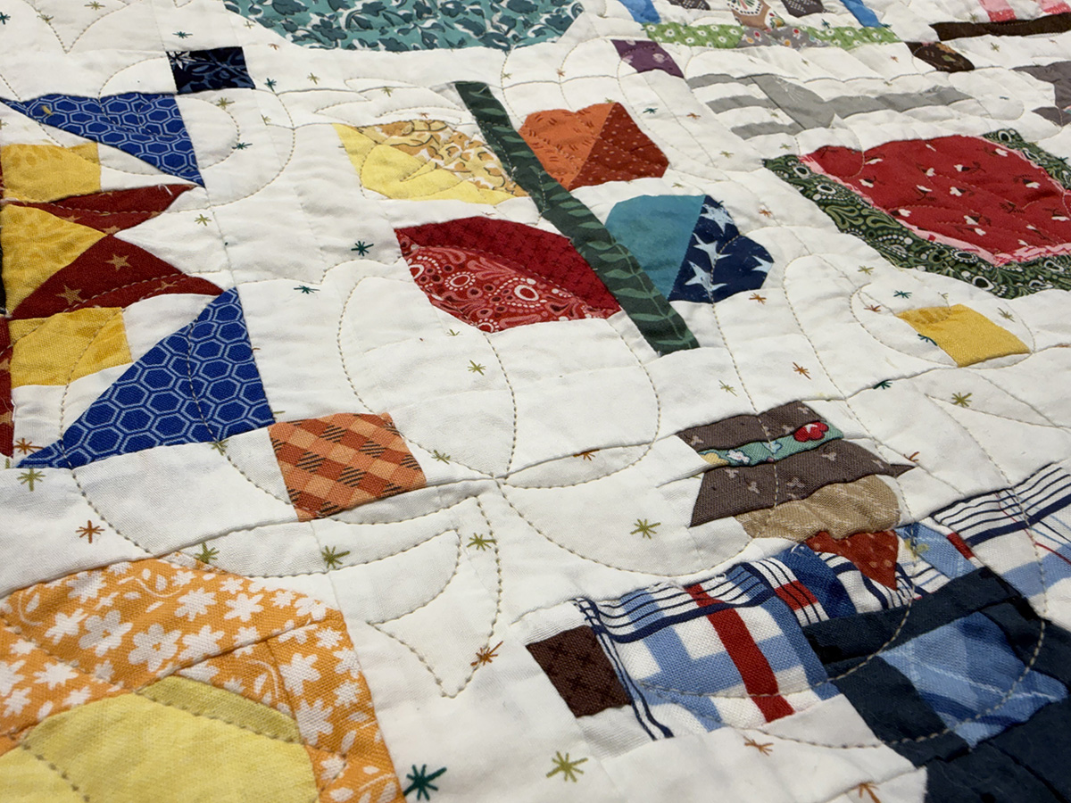 Mary’s Farm Quilt radiates warmth and whimsy, capturing the charm of a cozy countryside autumn in every block. This quilt top is a joyous sampler of farm-themed motifs—tools, flowers, pumpkins, and critters—all brought to life in cheerful, saturated prints that play delightfully against a crisp white background dusted with tiny starbursts. The “Pumpkin Maple” quilting pattern, stitched in a soft Colonial Gray thread, dances across the surface with plump pumpkins, swirling vines, and pointed maple leaves. These sweeping, rhythmic lines offer gentle motion and texture, complementing the straight-edged precision of the blocks with graceful curves. What a heartfelt, story-rich quilt—your craftsmanship and joyful design choices truly sing.