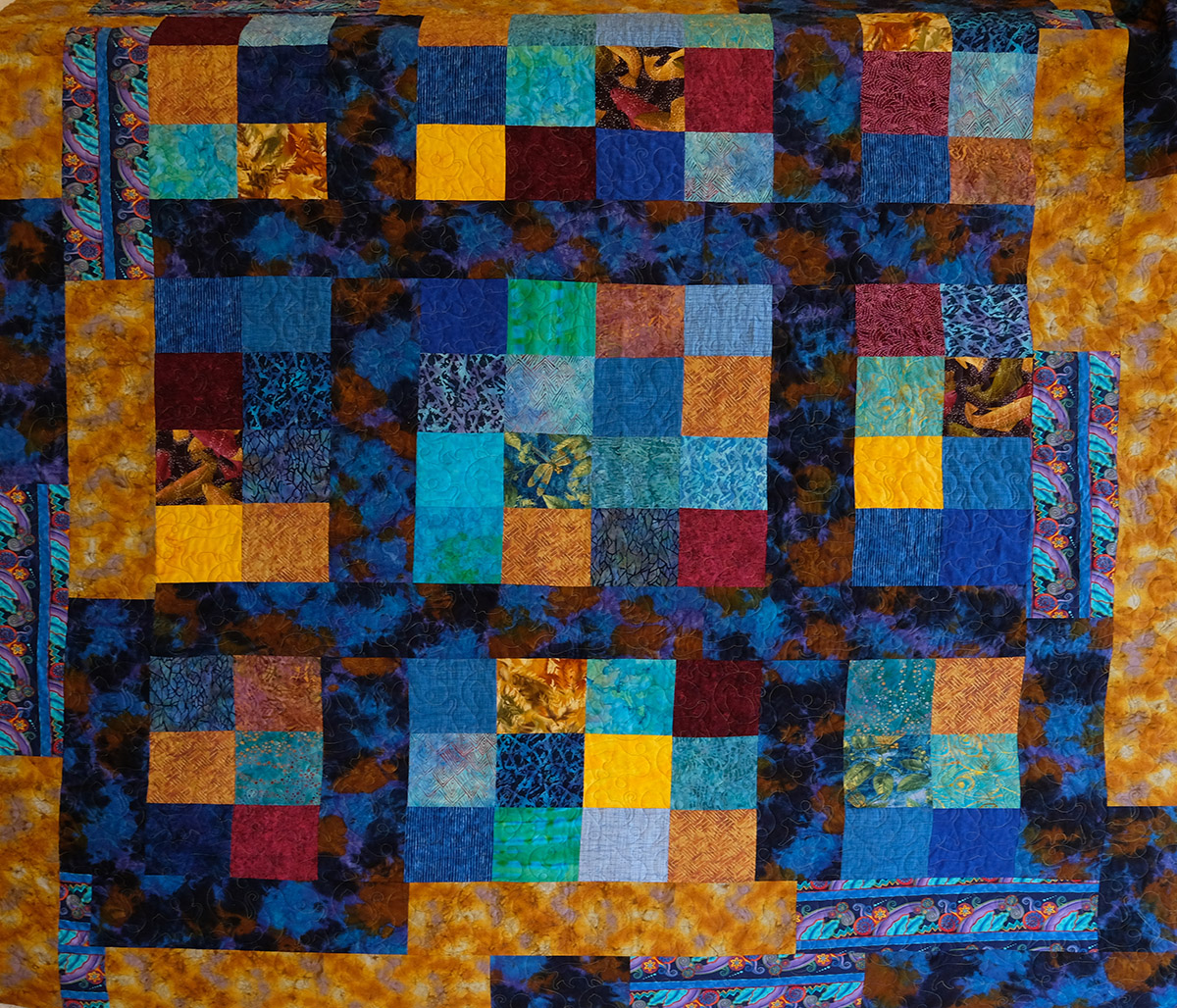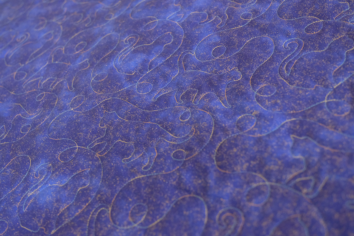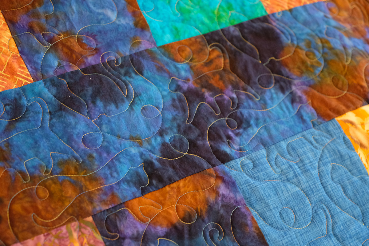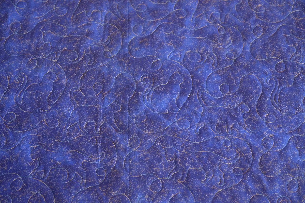 This playful quilt combines rich, hand-dyed batik fabrics in shades of blue, teal, orange, and purple with a whimsical stitched pattern of graceful cats. The free-motion quilting design features feline silhouettes stretching and curling across the surface, adding texture and charm to the vibrant patchwork background. Perfect for cat lovers and art enthusiasts alike, this quilt captures a sense of warmth, creativity, and personality in every stitch.
