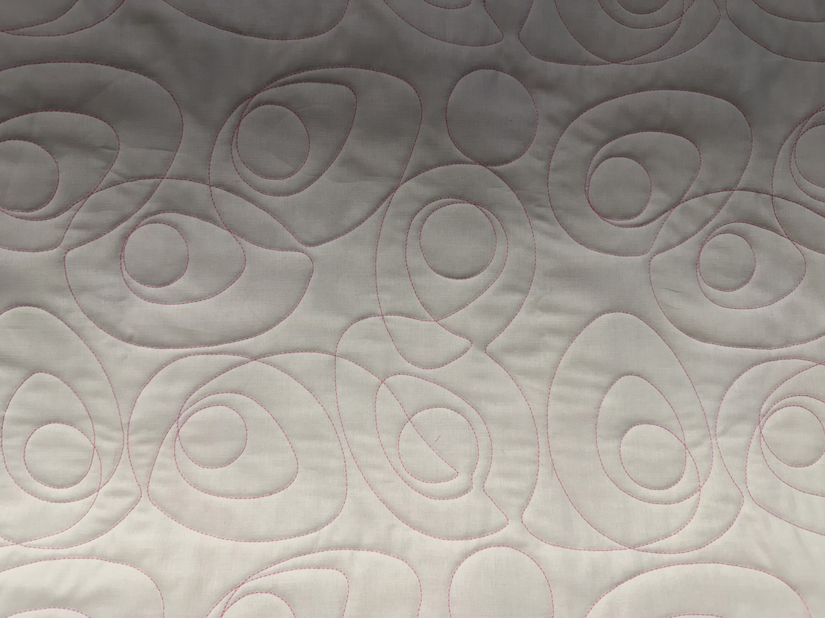 Ms. Pac-Man is a jubilant quilt bursting with charm, where playful geometry and whimsical patterning come together in joyful harmony. The top features a rich medley of warm golds, retro pinks, earthy browns, and airy blues, with prints that range from delicate florals to bold novelty motifs, giving each row a unique rhythm. In contrast, the quilting pattern—stitched in sweet Candy Pink thread—adds a fluid and modern energy, looping in the distinctive “Avocado” design with concentric ovals that soften the angularity of the piecing. The thread’s gentle sheen and unexpected path create delightful moments where it dances over birds, stars, and blossoms. This quilt radiates personality and heart—an absolute treasure of thoughtful design and confident execution.