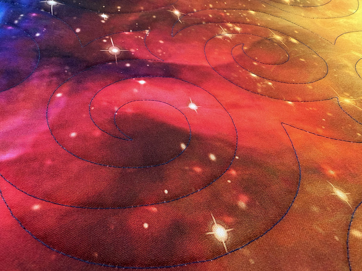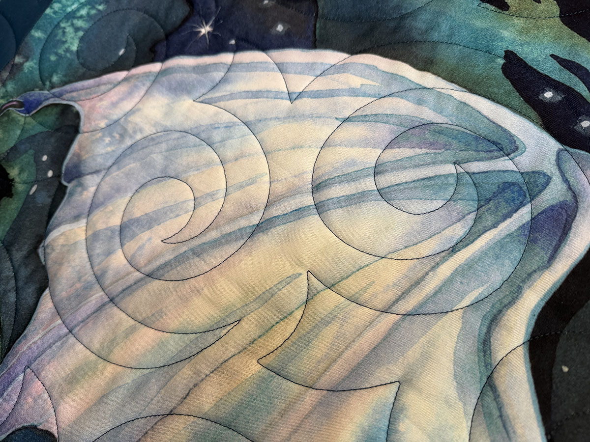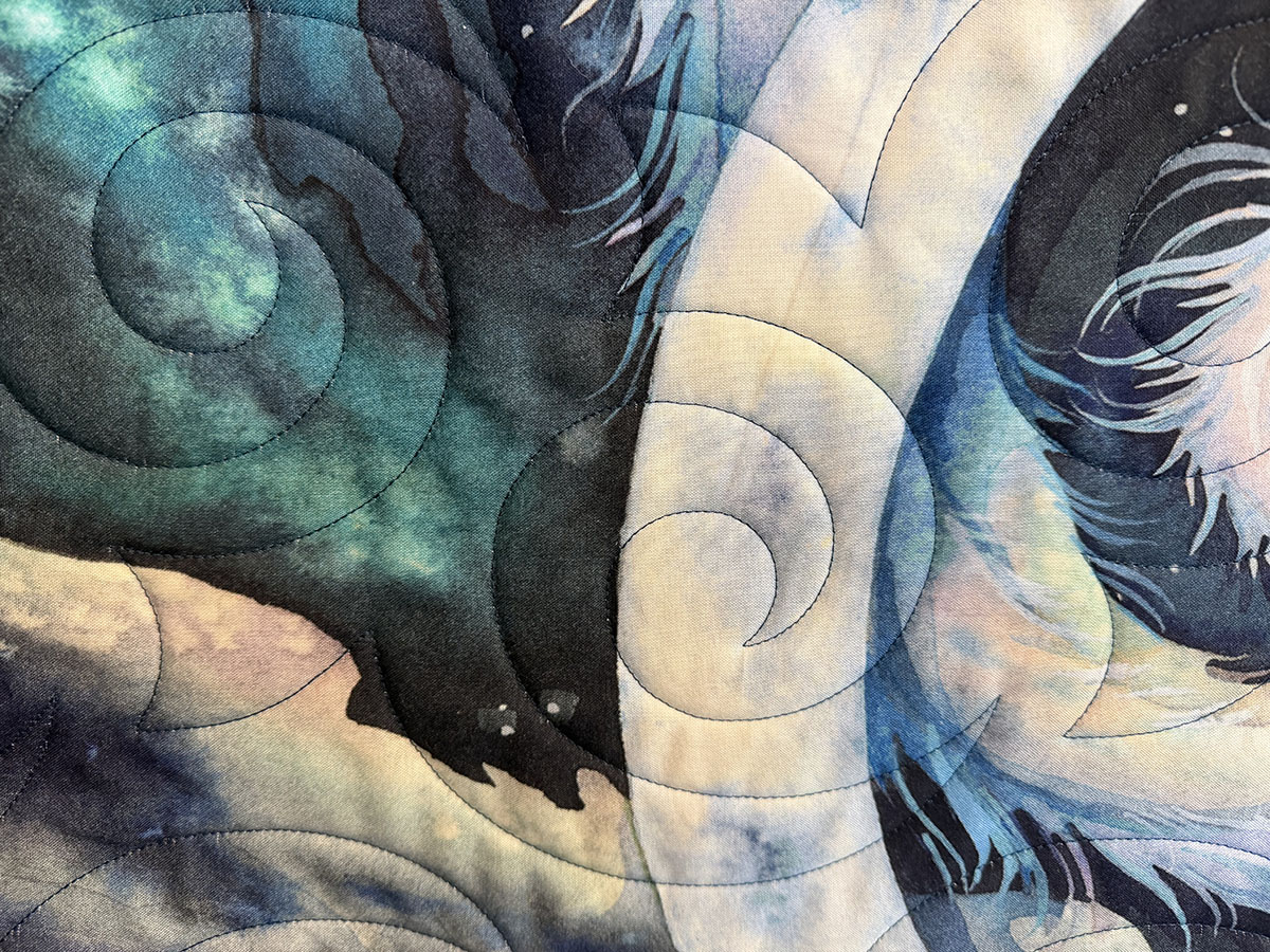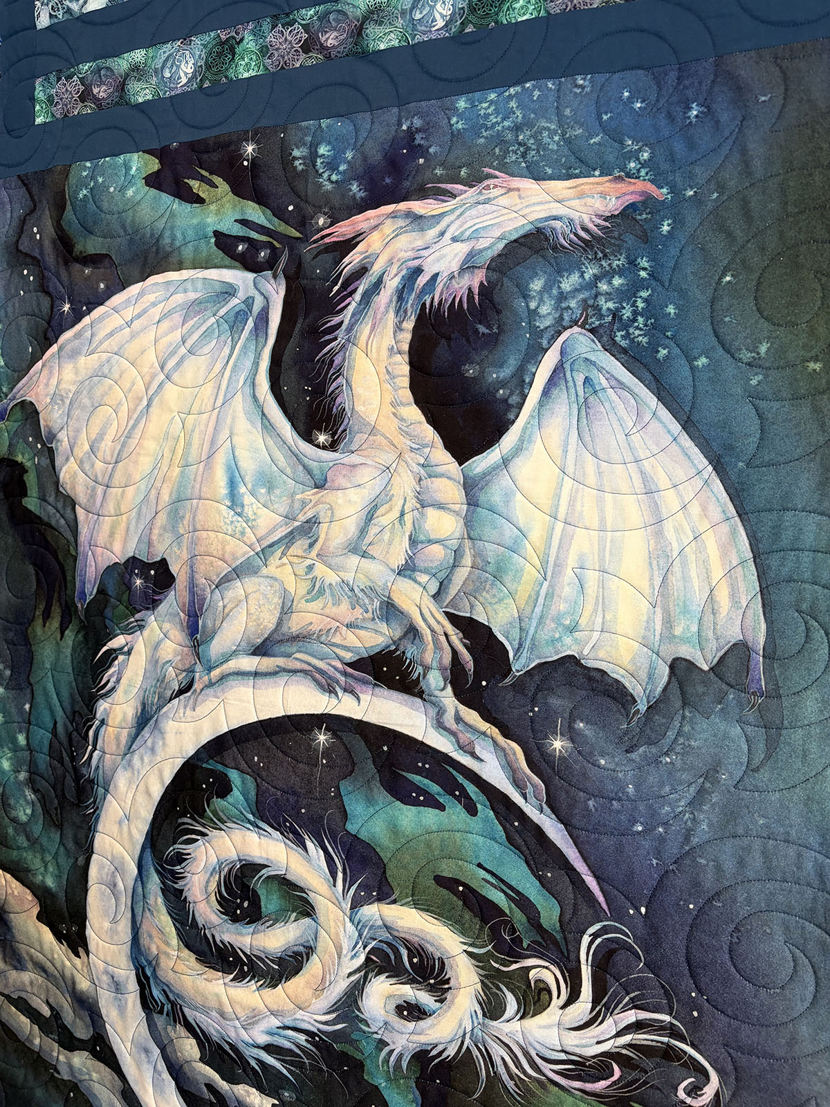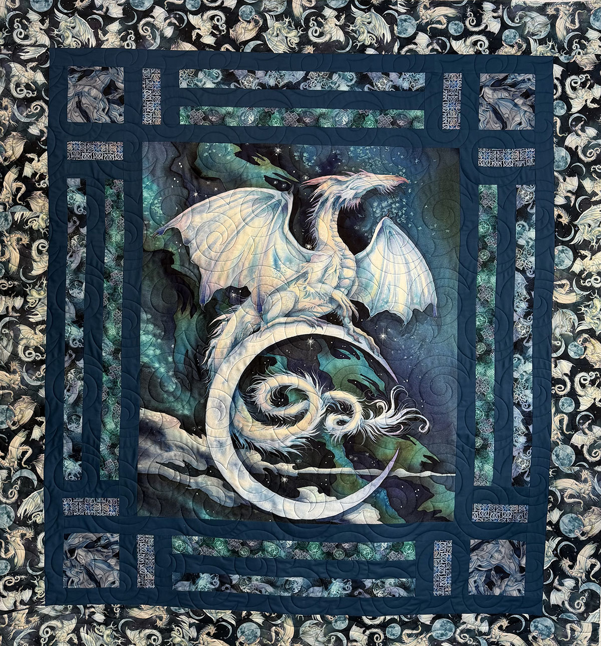 Mystic Dragon is bold, dramatic, and full of motion. The Turbulence quilting pattern sweeps across the quilt in large swirling spirals, echoing wind, energy, and magical force. Those curves flow beautifully over the dragon panel and continue through the borders, helping the entire design feel unified and alive. The New England Blue thread is a perfect choice, adding definition without distracting from the rich artwork. It blends smoothly into the deep navy, teal, and aqua tones while still standing out enough on the lighter dragon to show off the quilting. The layered palette of midnight blue, icy white, turquoise, and hints of green gives the quilt a luminous, otherworldly quality. Overall, this quilt feels powerful, mystical, and elegant. The combination of the striking dragon image, dark celestial fabrics, and swirling quilting creates a sense of fantasy and movement, as if the dragon is rising through a storm-filled night sky.
