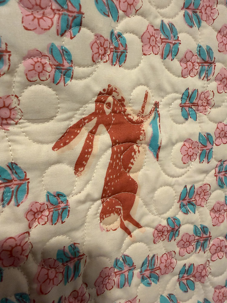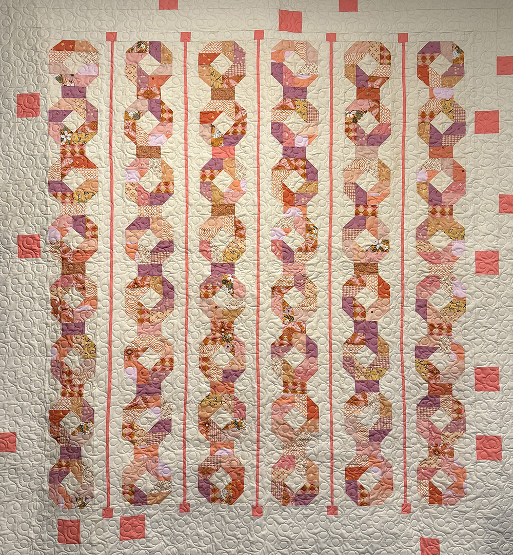 Peaches & Cream is a soft, playful quilt with a fresh modern rhythm. The patchwork columns are built from curvy, candy-like shapes in peach, blush, coral, apricot, and lavender, while pops of warm orange and tiny novelty prints add charm and personality. Set against the creamy background and framed with bright pink accent lines, the design feels light, balanced, and full of cheerful movement. The Loops quilting pattern adds another layer of energy with flowing curves and rounded circles that echo the quilt’s pieced shapes beautifully. Quilted in cream thread, the stitching blends gently into the background and across the patchwork, creating texture without overpowering the fabric choices. The result is a quilt that feels sweet, airy, and inviting—warm and whimsical with a polished, contemporary finish.