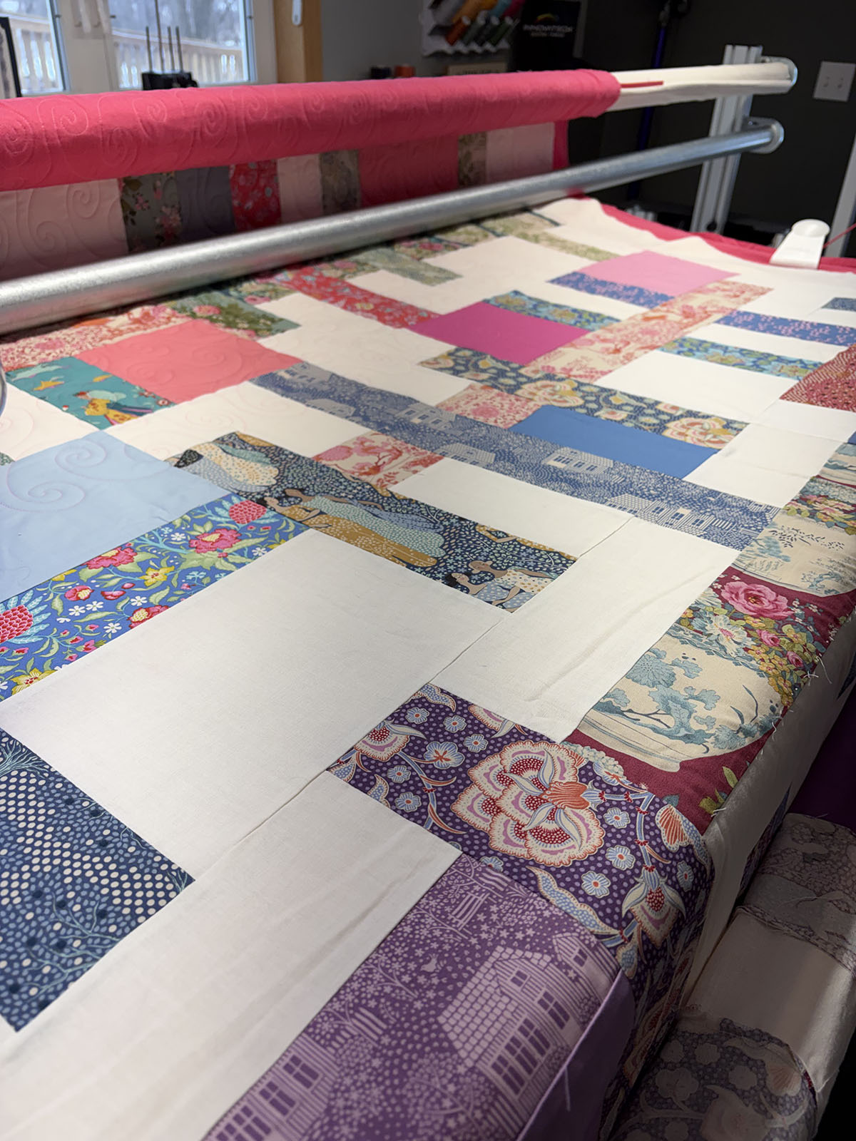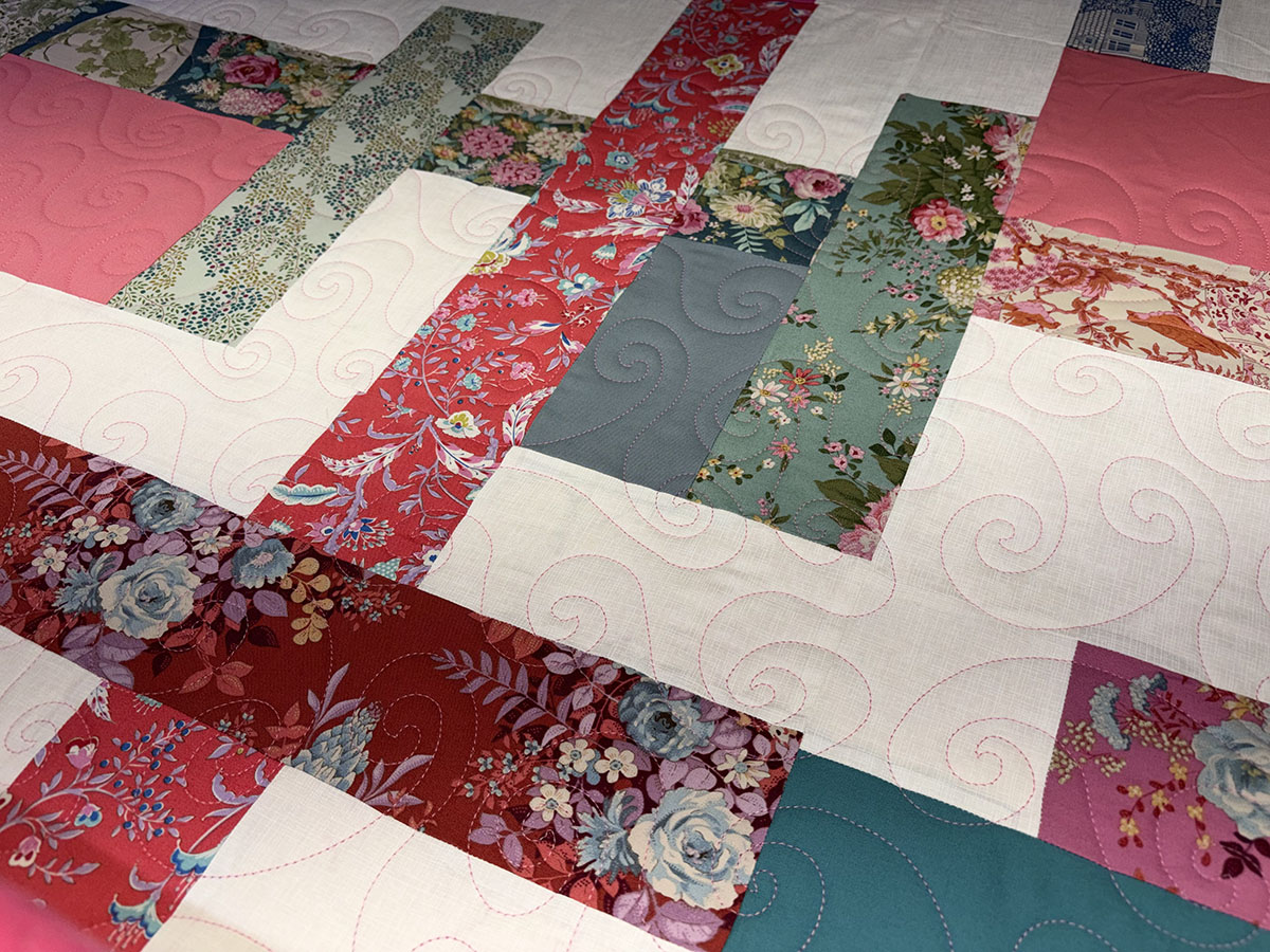 Pinkie is a fresh, lively quilt full of movement and charm. The Van Gogh quilting pattern sweeps across the quilt with flowing curves and soft spirals, adding graceful texture and an artistic sense of motion. Stitched in Candy Pink thread, the quilting stands out just enough to enhance the design while blending beautifully with the quilt’s warm, playful palette. The mix of rosy pinks, rich florals, soft creams, teals, and lavenders creates a look that feels both romantic and cheerful. The patchwork layout gives the quilt a modern, open feel, while the varied prints bring in personality and depth. Overall, this quilt feels bright, whimsical, and elegant—full of color, softness, and creative energy.
