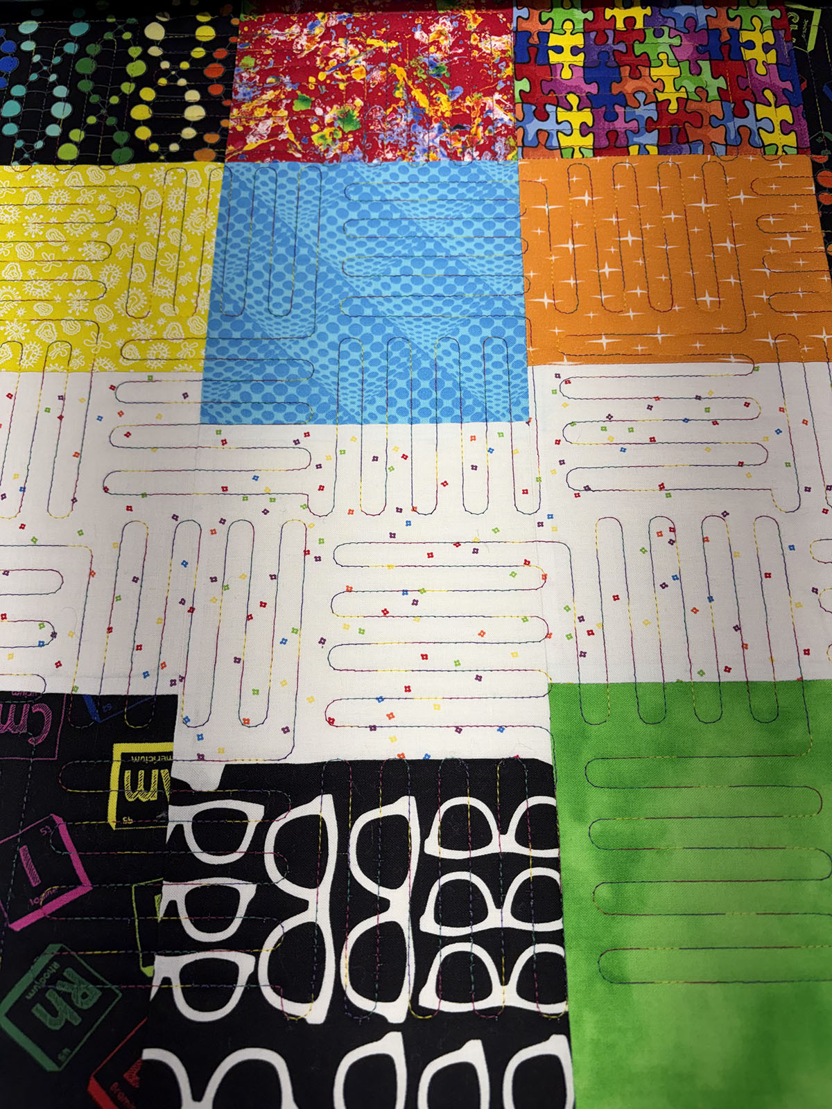 Primary Colors is a bold, energetic quilt that feels playful and modern. The Tracks quilting pattern adds a strong sense of movement, with long, looping lines traveling across the blocks like connected pathways. That flowing design gives structure to the lively mix of prints while keeping the overall look fun and rhythmic. The variegated primary color thread is a standout detail, shifting through bright tones that echo the quilt’s vivid palette. It brings extra life to the white sections especially, where the thread becomes a colorful design element all on its own. Against the black prints and saturated blocks of orange, green, blue, yellow, and red, the quilting adds texture without overwhelming the fabrics. Overall, this quilt has a cheerful, expressive feeling—creative, bright, and full of motion. It balances graphic contrast with a sense of whimsy, making it feel both contemporary and joyful.