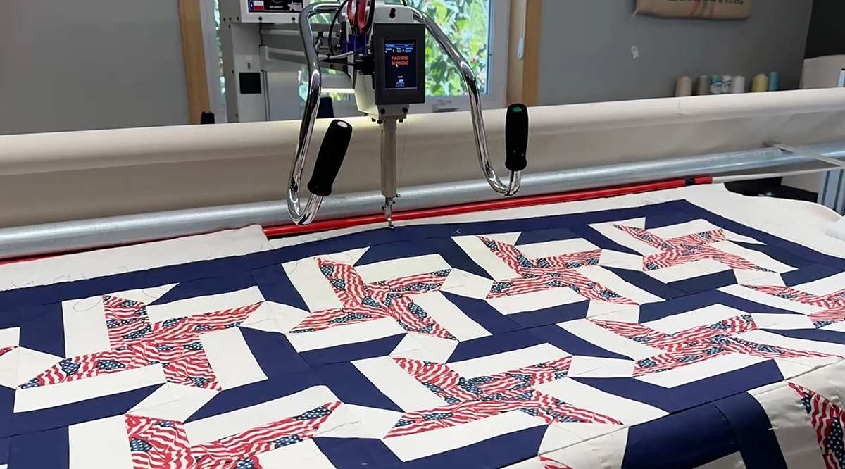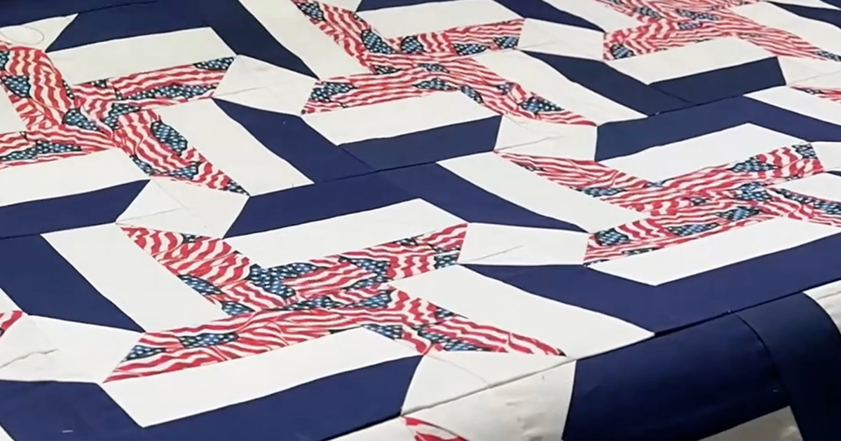 This striking quilt celebrates patriotism with bold red, white, and blue fabrics arranged in a dynamic star pattern. Each star features swirling flag-inspired prints framed by deep navy and crisp white, creating a powerful sense of movement and pride. This piece beautifully combines precision craftsmanship with heartfelt tribute — a stunning representation of honor, courage, and American spirit.