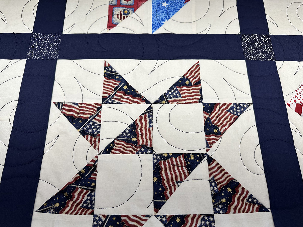 Quilt of Valor is a heartfelt tribute wrapped in the colors of patriotism and pride. The quilt radiates honor and reverence, echoing the steadfast spirit of service and sacrifice. Each block is meticulously pieced with Americana fabrics—stars, stripes, hearts, and emblems—forming bold, radiant stars set against a field of creamy white and deep navy sashing. The navy blue thread flows in the “Breath Of The Gods” pattern, arching in serene, swirling curves across the surface like a gentle wind passing over a flag in motion. These graceful spirals soften the strong geometric piecing, tying the entire quilt together with a sense of calm movement. This quilt is a beautiful, dignified expression of gratitude—its craftsmanship sings with both skill and heart.