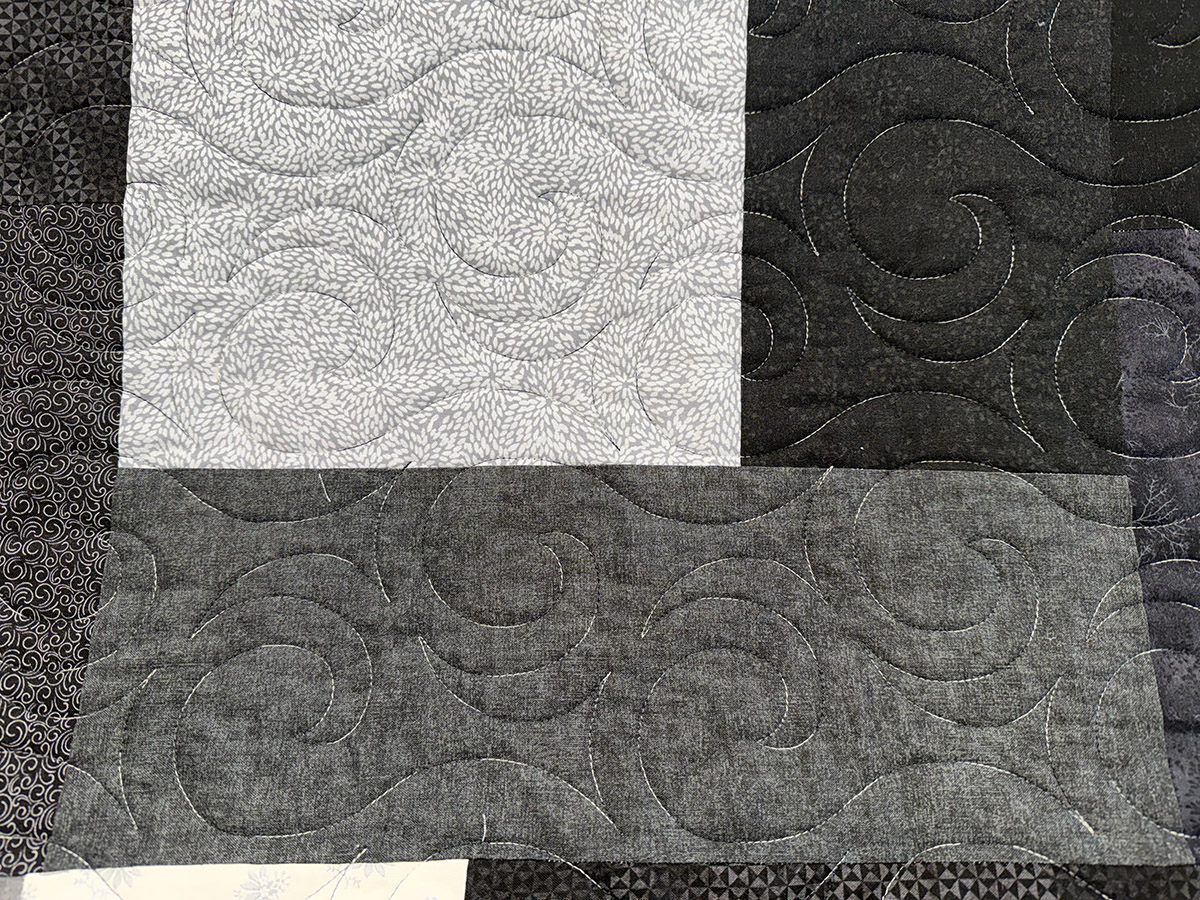 Tristan’s Quilt is a serene symphony in grayscale, whispering calm with every swirling stitch. The soft interplay of charcoal, ash, and fog-toned blocks creates a grounded yet ethereal presence, evoking quiet strength. The top is pieced with a wide variety of grayscale prints, from whispery florals to bold geometrics, brought to life by the “Breath of the Gods” quilting design—an elegant dance of sweeping curves and spirals. Quilted with Superior Threads #9025, the variegated black and white thread glides fluidly across the surface, shifting in tone to harmonize with each block’s shade, adding depth and motion. This quilt is a breathtaking expression of balance and grace—absolutely masterful.