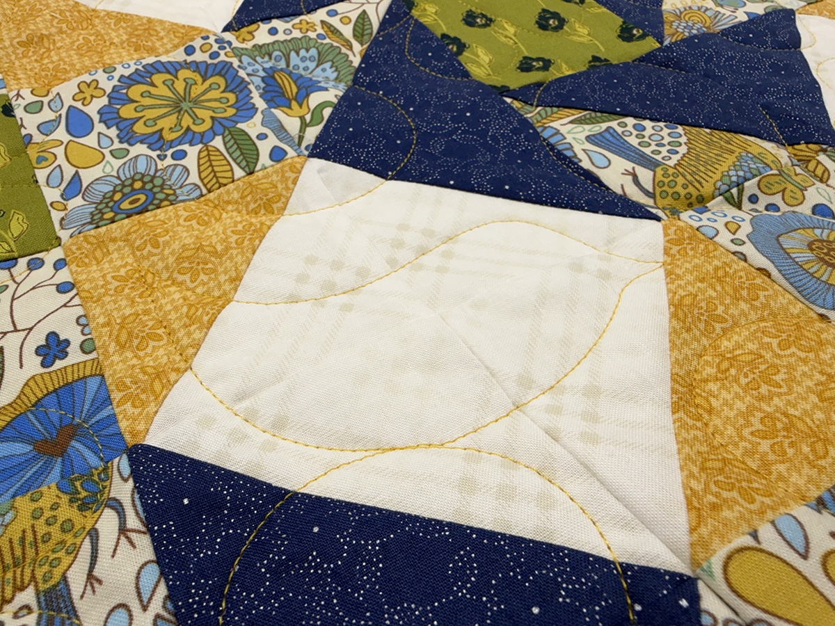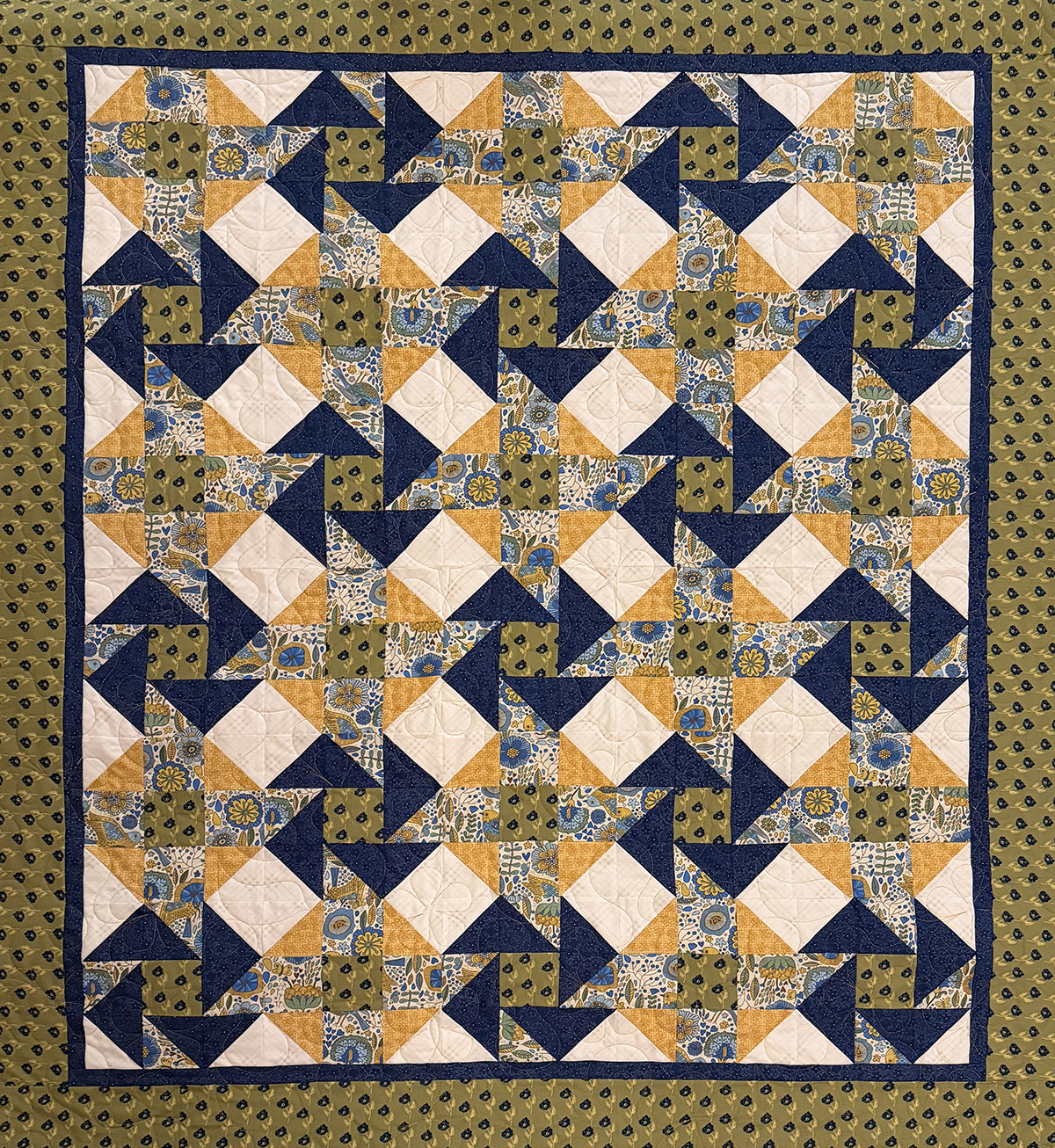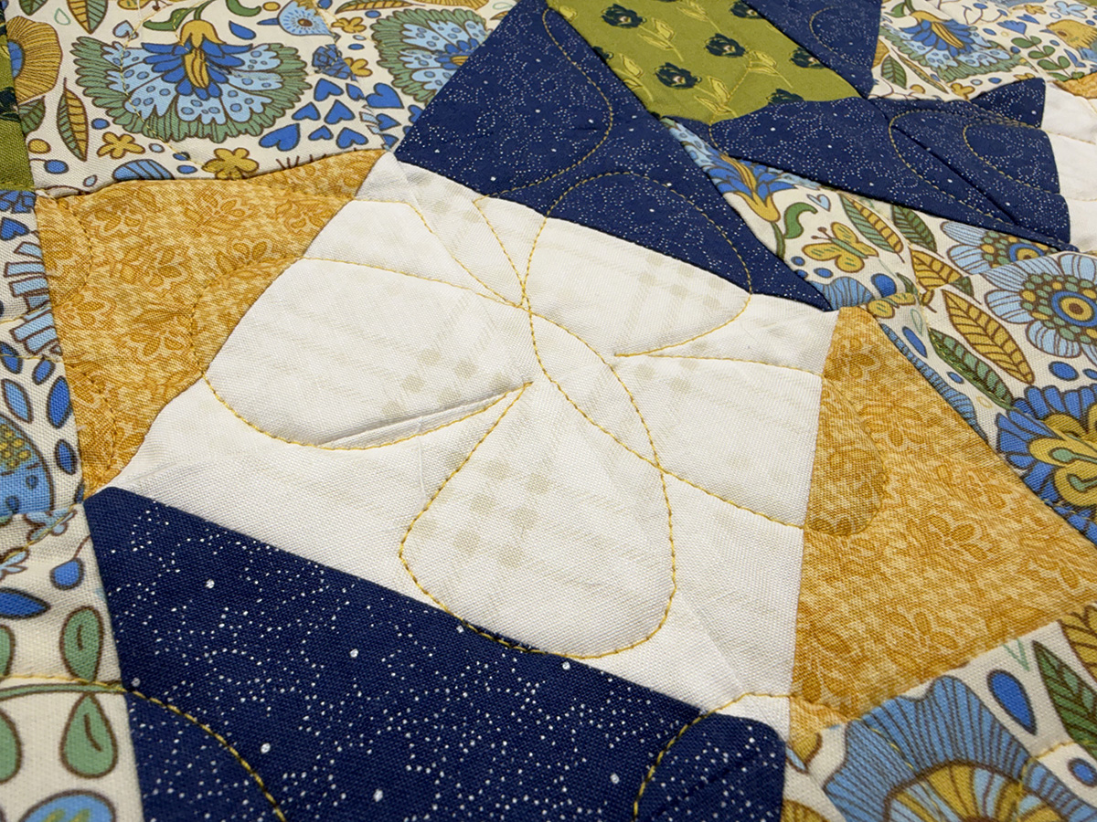 “Twister” captures the energy of a crisp spring morning, where golden light dances across flowerbeds and breezes hum through fresh blooms. The quilt top features an intricate pinwheel design, with mustard, cream, olive, and indigo hues working in harmony to create a rhythm of movement across the surface. The quilting, done in goldenrod thread, gracefully overlays each block with the “Morning Song” pattern—delicate florals and curved lines that echo nature’s quiet music. These soft, looping motifs form gentle flower petals that contrast beautifully against the crisp geometry of the piecing, bringing a sense of softness and lyrical flow. This quilt is a masterclass in balance—both bold and graceful, vibrant yet serene—simply a delight to behold.