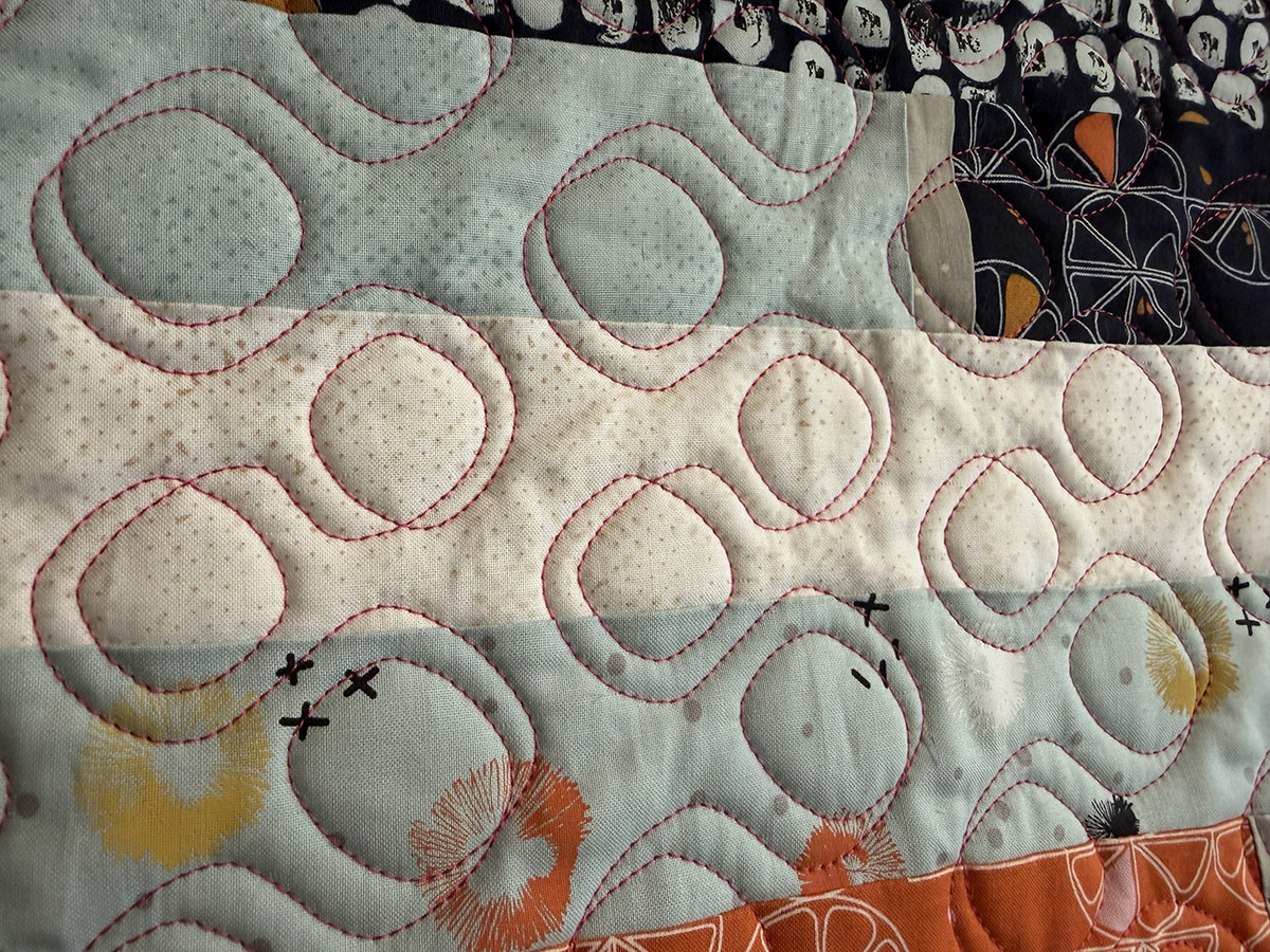 The "Belly Bop" quilt pattern features playful, curvy lines that evoke a sense of movement and whimsy. The design consists of overlapping, rounded shapes that suggest a lighthearted theme, reminiscent of dance or joyful motion. The flowing, organic forms create a dynamic interplay, encouraging a cheerful and fun atmosphere, perfect for a cozy space or a vibrant child's room. Overall, the pattern embodies a spirited, carefree mood that invites creativity and warmth.